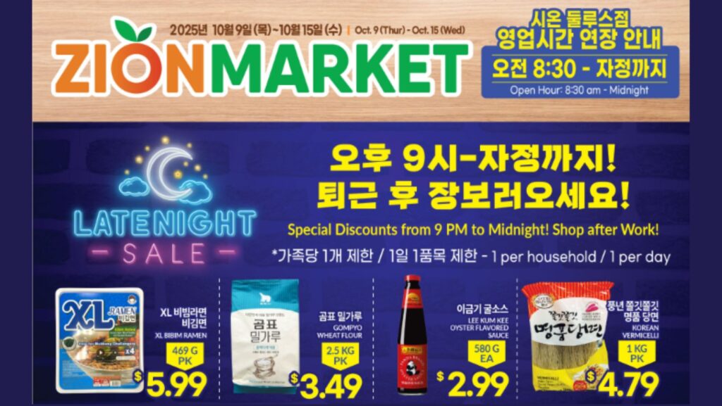 시온마켓 둘루스점은 고객 편의를 위해 ‘Late Night Sale’을 통해 매일 오후 9시부터 자정까지 특별 할인 행사를 진행한다. 행사 품목은 1가족당 1일 1품목으로 제한된다.