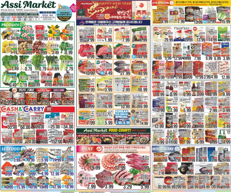 아씨마켓은 이번 연말연시를 맞아 제수용품과 겨울철 인기 먹거리를 대거 포함한 특별 세일전을 마련했다. 주요 세일 품목으로는 △칠갑농산 쌀떡국떡과 사골곰탕 번들($4.99) △아씨 찹쌀왕만두피 12.69oz($1.99) △비비고 동그랑땡 16oz($6.99) △산적고기(LB, $8.99) △양지머리(LB, $10.99) △LA갈비 패밀리팩(LB, $10.99) △한국산 모아 포기김치 3.2kg($22.99) △모듬회 스페셜(PACK, $40.99) △전주 수제 초코파이 10입($18.99) △아씨 찰옥수수(PACK, $3.99) 등이 포함됐다. 제수용품부터 겨울철 대표 먹거리까지 실속 있게 구성된 이번 세일은 연말과 새해를 준비하는 고객들의 높은 관심이 기대된다.