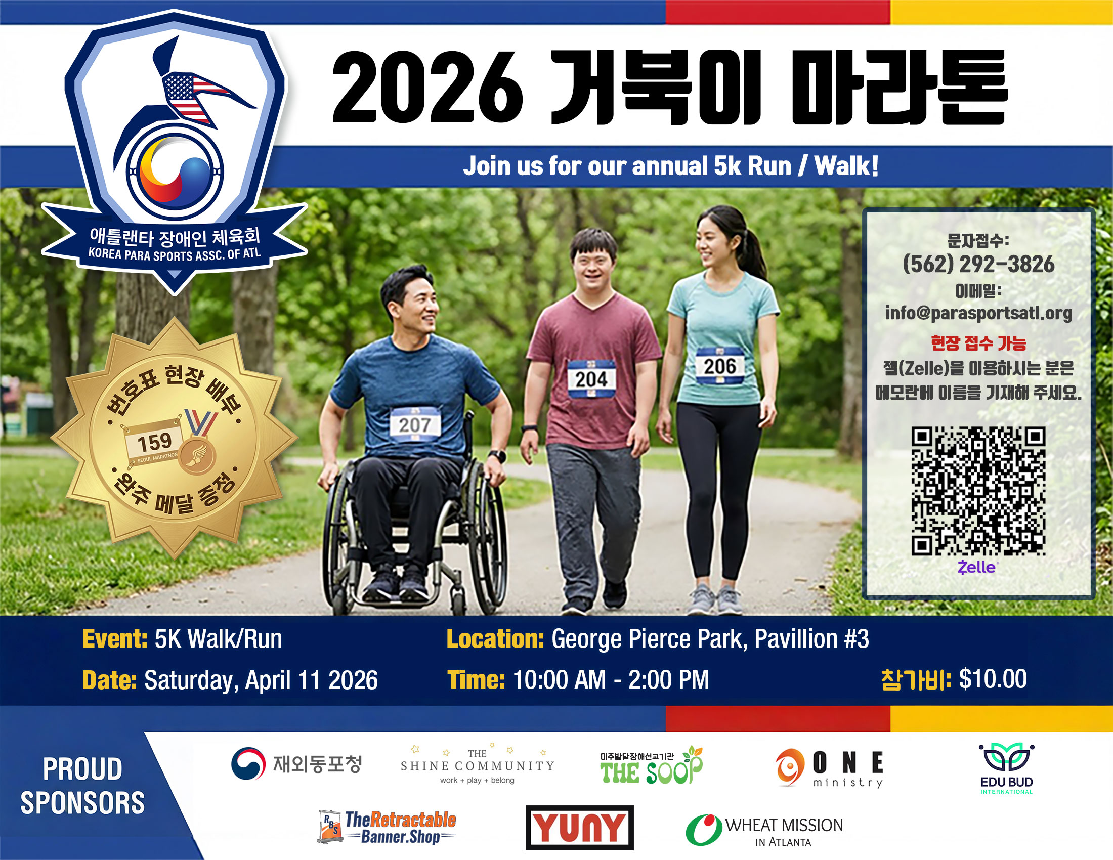 아틀란타장애인체육회(회장 박승범)가 장애인의 날을 기념해 오는 4월 11일(토) 오전 10시부터 오후 2시까지 조지 피어스 파크(George Pierce Park) 파빌리온 3 주차장에서 ‘2026 5K 거북이 마라톤’을 개최한다.