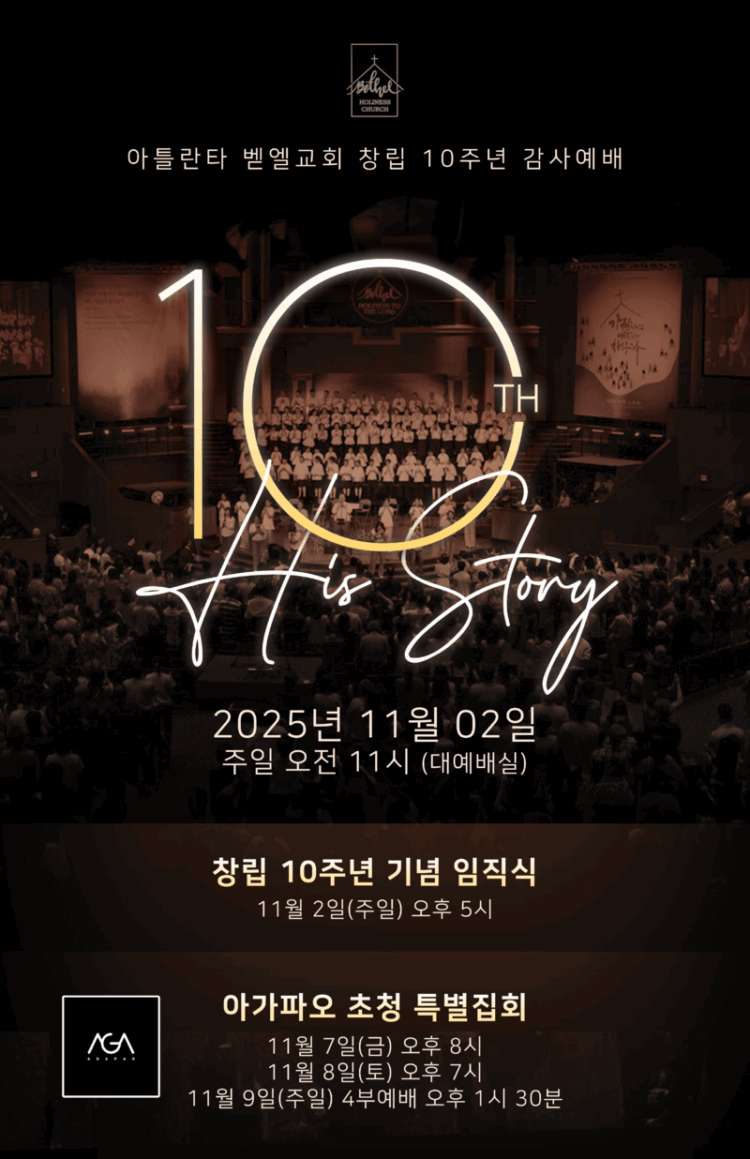 한편, 벧엘교회는 10주년을 기념해 11월 7일(금) 오후 8시, 8일(토) 오후 7시, 9일(주일) 오후 1시 30분 ‘아가파오 초청 특별부흥집회’를 개최한다. 이번 집회를 통해 지난 10년간의 하나님의 은혜를 되새기고, 다가올 시대를 향한 부흥과 선교의 비전을 선포할 예정이다.