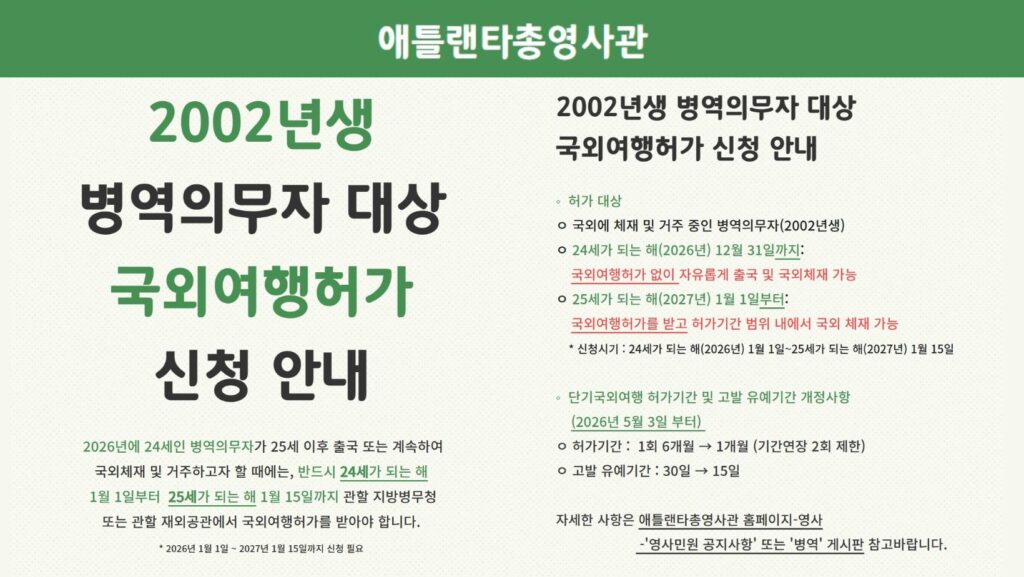 애틀랜타총영사관은 2002년생 병역의무자를 대상으로 국외여행허가 신청과 관련한 사항을 안내했다.