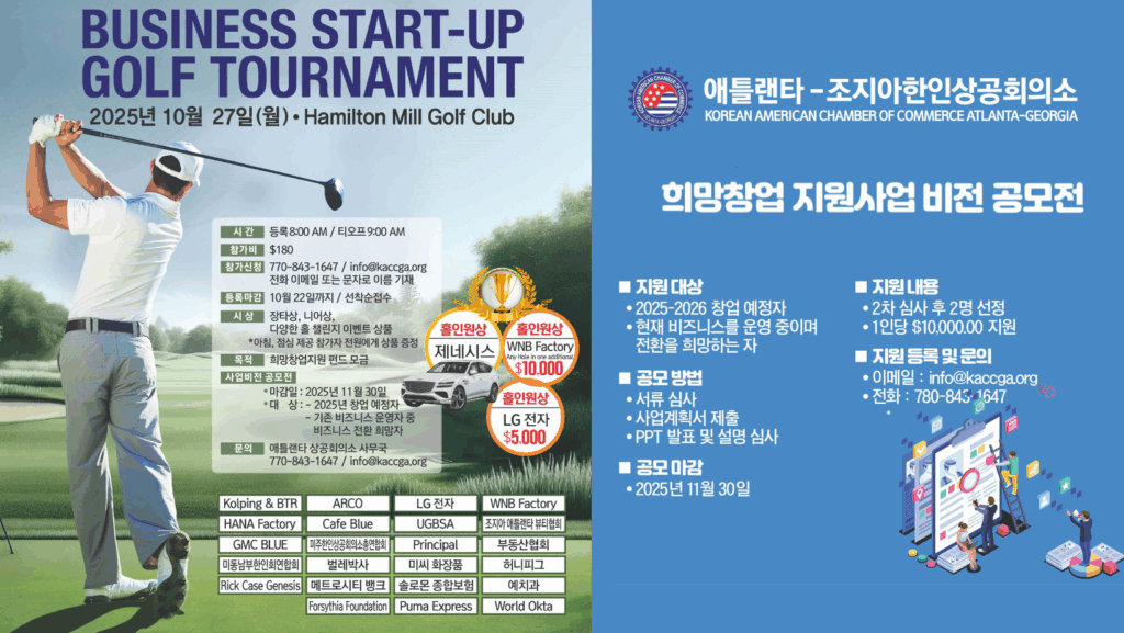 애틀랜타조지아한인상공회의소(회장 한오동)가 한인 창업자들을 지원하기 위한 ‘비즈니스 스타트업 골프 토너먼트’를 오는 27일(월), 다큘라 소재 해밀턴 밀 골프클럽(Hamilton Mill Golf Club)에서 개최한다.
