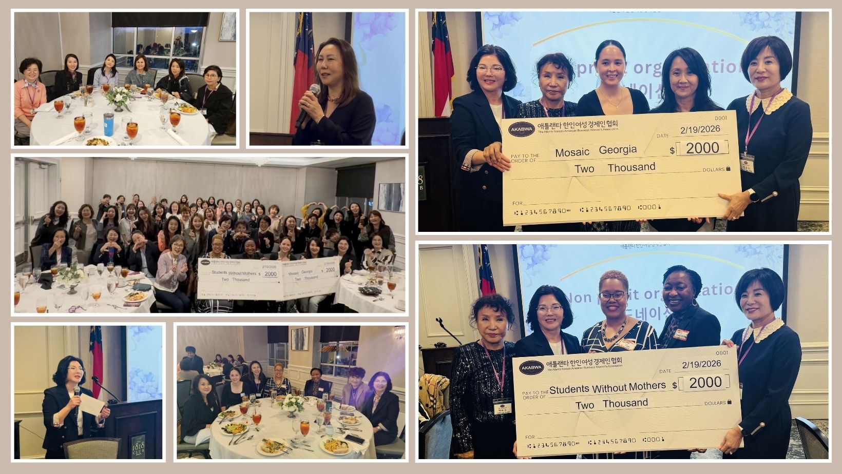 이날 모임에서는 지난해 12월 송년모임을 통해 마련한 기금을 지역사회에 환원하는 뜻깊은 순서도 마련됐다. 협회는 비영리단체 ‘어머니 없는 아이들(Students Without Mothers)’과 Mosaic Georgia에 각각 2,000달러씩 총 4,000달러의 후원금을 전달했다.