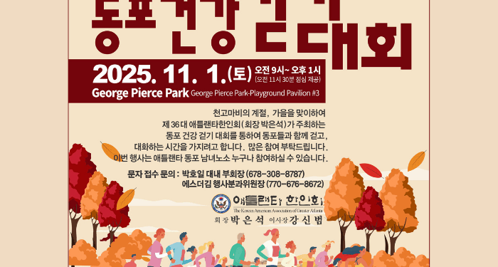 한인회는 “이번 행사는 건강한 몸과 마음을 함께 나누는 동시에, 애틀랜타 한인사회의 다양한 의견을 직접 듣는 소통의 자리가 될 것”이라며 “동포 여러분의 적극적인 참여와 고견이 지역사회 발전에 큰 힘이 될 것”이라고 전했다.