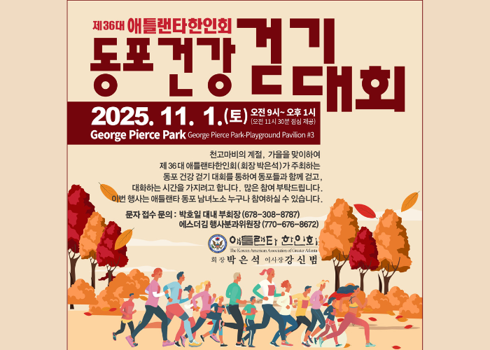 한인회는 “이번 행사는 건강한 몸과 마음을 함께 나누는 동시에, 애틀랜타 한인사회의 다양한 의견을 직접 듣는 소통의 자리가 될 것”이라며 “동포 여러분의 적극적인 참여와 고견이 지역사회 발전에 큰 힘이 될 것”이라고 전했다.