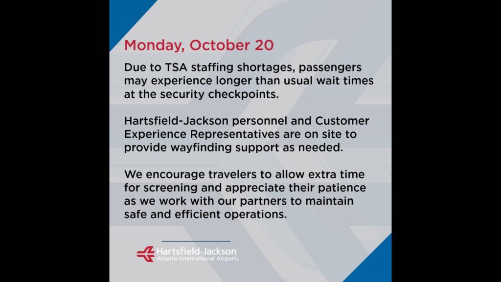 조지아주 교통국(GDOT)은 “보안 검색 절차에 상당한 지연이 발생할 수 있다”며 “탑승객들은 출발 시간 최소 3시간 전에 공항에 도착할 것”을 권고했다.