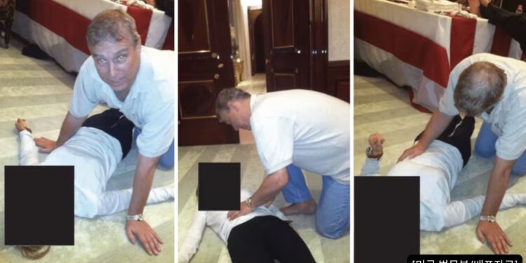 영국 찰스 3세 국왕의 동생인 앤드루 전 왕자가 바닥에 누운 여성의 신체에 손을 대는 사진이 공개돼 파장이 일고 있다.