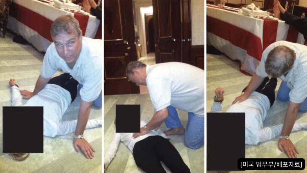 1일 BBC와 가디언 등 영국 언론에 따르면 미 법무부가 지난달 30일 추가로 공개한 ‘엡스타인 파일’에는 앤드루 전 왕자가 실내 바닥에 누워있는 한 여성과 함께 찍힌 사진들이 포함됐다.