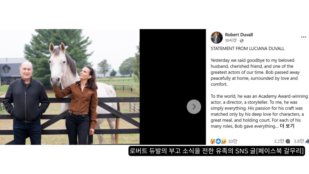 고인의 배우자 루치아나 듀발은 16일(현지시간) 페이스북을 통해 “어제 나의 사랑하는 남편이자 소중한 친구, 우리 시대 위대한 배우 가운데 하나였던 이와 작별을 고했다”며 “로버트가 집에서 사랑하는 사람들에 둘러싸인 채 평화롭게 세상을 떠났다”고 전했다.