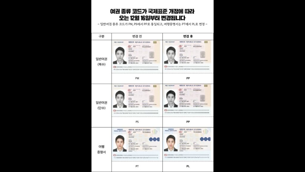 외교부에 따르면, 일반여권은 기존 PM(복수여권), PS(단수여권) 구분 없이 ‘PP’로 통일되며, 여행증명서는 현행 ‘PT’에서 ‘PL’로 변경된다. 이는 국제표준 준수를 통해 여권의 보안성과 상호운용성을 강화하기 위한 조치다.