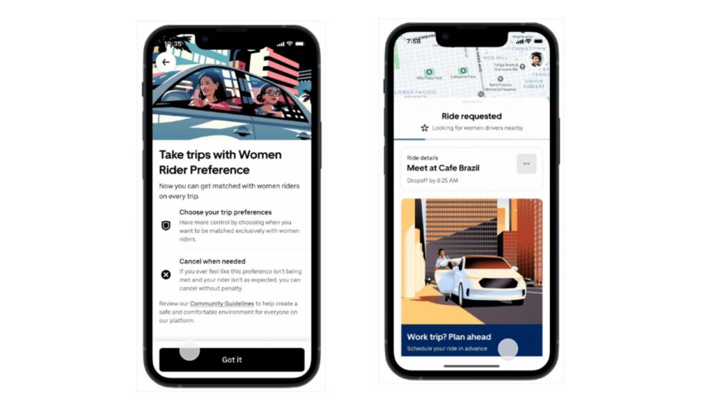 이 기능은 여성 승객이 앱에서 여성 운전자를 요청할 수 있고, 여성 운전자 역시 여성 승객을 선호하도록 설정할 수 있는 옵션을 제공하는 것이 특징이다.