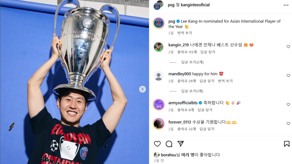한국 선수가 이 상을 받은 건 손흥민(LAFC), 김민재(뮌헨)에 이어 이강인이 세 번째다.