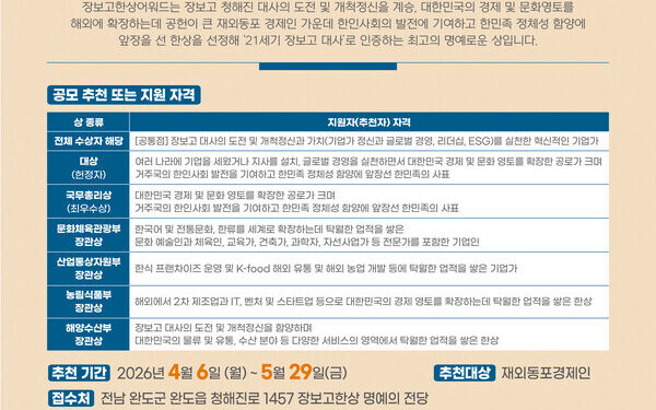 전남 완도군과 장보고글로벌재단(이사장 김덕룡)은 장보고한상 어워드 공모를 시작했다고 7일 밝혔다.