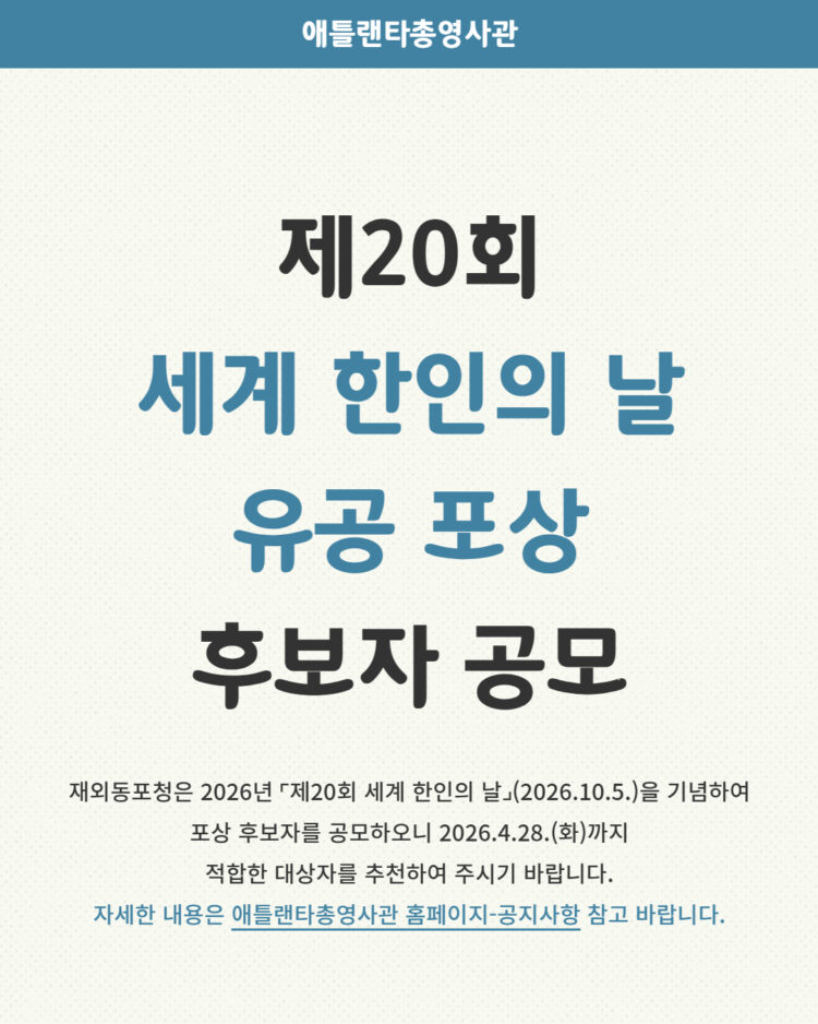 이번 공모는 재외동포의 권익 신장과 대한민국 및 동포사회 발전에 기여한 개인 및 단체를 발굴하기 위한 것으로, 접수는 28일(화)까지 진행된다.