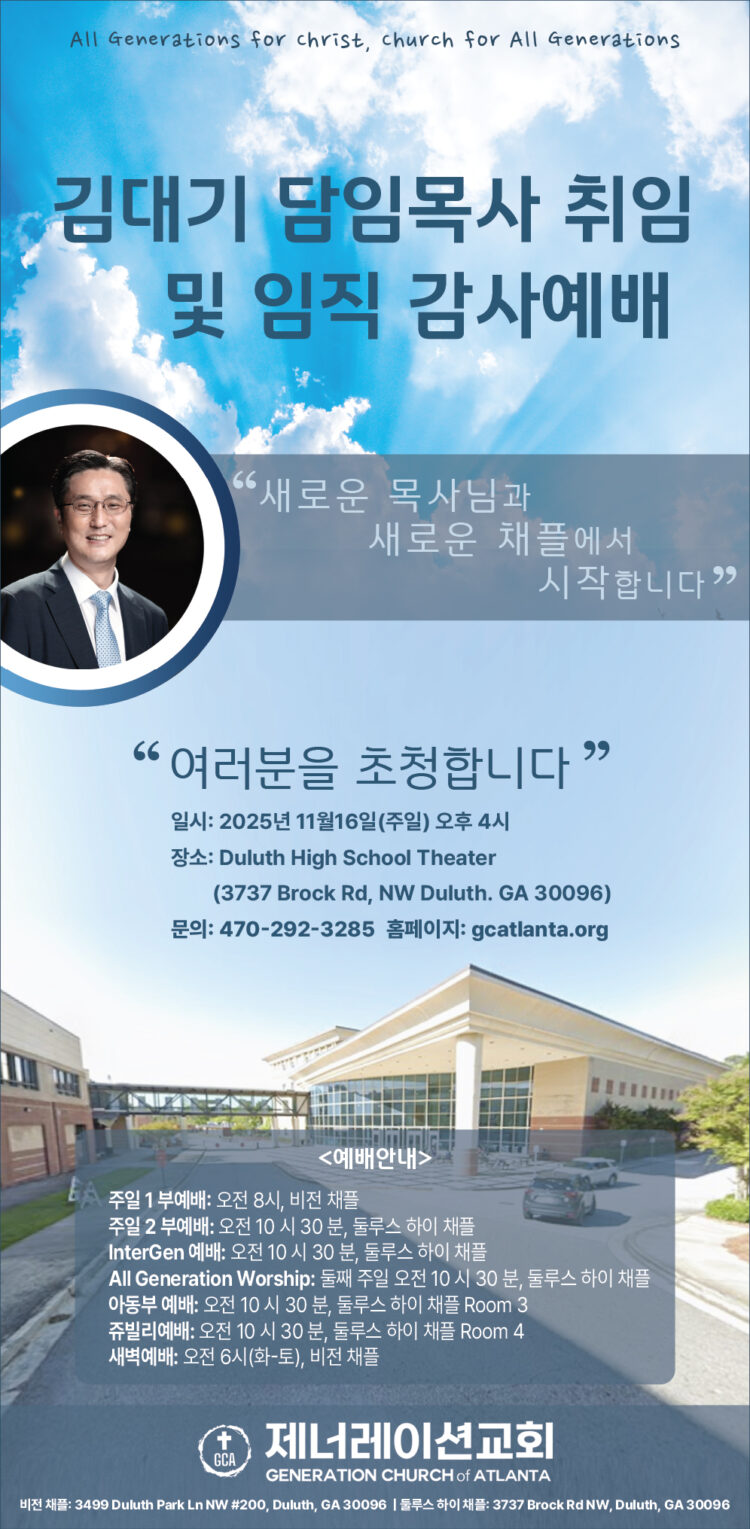 둘루스 소재 제너레이션교회(Generation Church of Atlanta, 이하 GCA)가 오는 16일(일) 오후 4시, 김대기 담임목사 취임 및 임직 감사예배를 둘루스 고등학교 극장에서 거행한다.