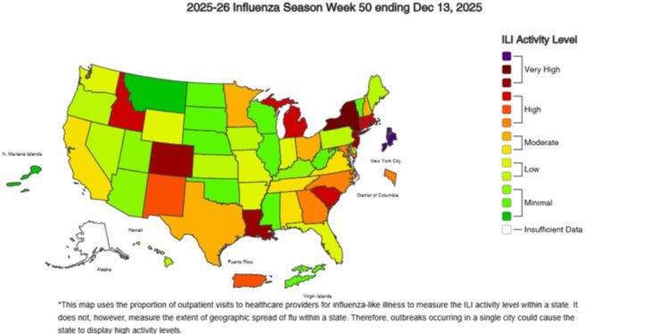 조지아주가 CDC(질병통제예방센터) 기준 ‘독감 활동 고위험(High)’ 단계에 올라섰다. 전국적으로도 17개 주가 ‘높음’ 또는 ‘매우 높음’ 수준을 기록하면서 연말 이동이 시작된 시점, 보건당국은 “독감 확산이 빠르게 증가하고 있다”며 경계를 당부했다.