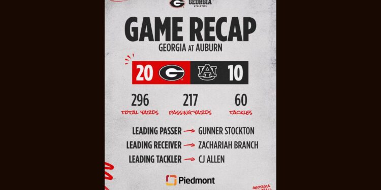 조지아는 11일 밤, 어번 타이거스(Auburn Tigers)를 20-10으로 꺾고 ‘딥사우스의 가장 오래된 라이벌전(Deep South’s Oldest Rivalry)’에서 9년 연속 승리를 기록했다.