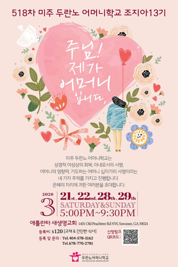 518차 미주 두란노 어머니학교가 주관하는 조지아 13기 어머니학교가 3월 21일(토)–22일(일), 28일(토)–29일(일) 총 4회에 걸쳐 오후5시-9시30분까지 주제 강의와 찬양, 간증, 그룹토의, 친교, 예식 등의 순서로 진행 될 예정이다.