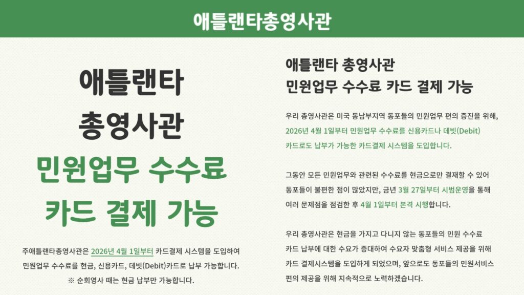 주애틀랜타총영사관은 “현금을 소지하지 않는 동포들이 증가함에 따라 카드 결제에 대한 수요가 꾸준히 늘어나고 있다”며 “수요자 중심의 맞춤형 서비스 제공을 위해 이번 시스템을 도입하게 됐다”고 밝혔다.