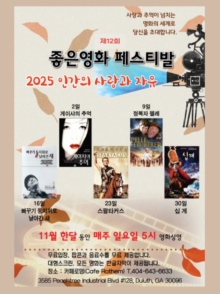 올해로 12회를 맞이한 ‘좋은영화 페스티벌’이 오는 11월 한 달간 매주 일요일 오후 5시, 조지아주 둘루스 소재 카페 로뎀에서 열린다.
