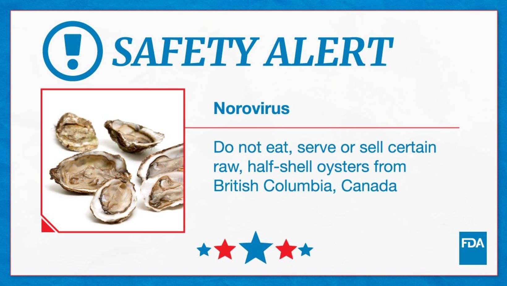 미 식품의약국(FDA)이 캐나다 브리티시컬럼비아주에서 수확된 일부 굴 제품에 대해 노로바이러스 오염 가능성이 있다며 식당과 소매업체에 판매·제공 중단을, 소비자에게는 섭취 금지를 권고했다.