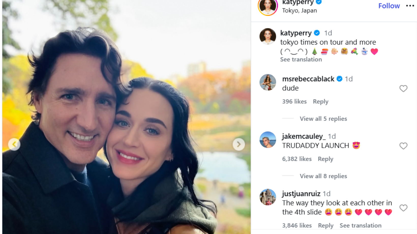 미국 팝스타 케이티 페리가 쥐스탱 트뤼도 전 캐나다 총리와 일본을 방문해 찍은 사진을 인스타그램에 공유하며 사실상 열애를 공식화했다.