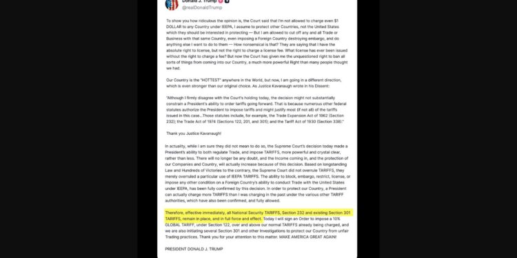 도널드 트럼프 미국 대통령은 20일 연방대법원이 위법하다고 판단한 관세를 대체할 새로운 관세를 부과하겠다고 밝혔다.