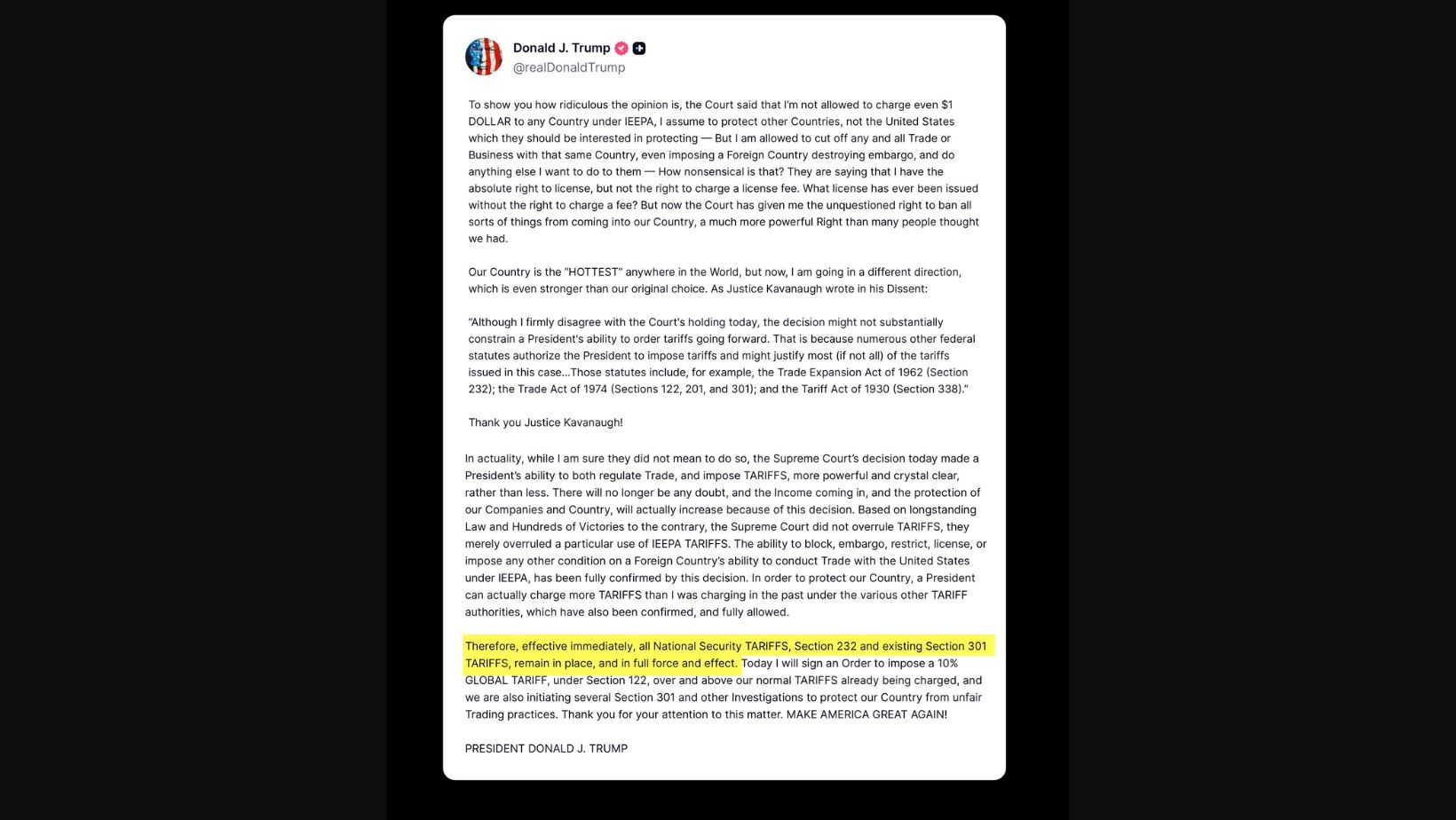 트럼프 대통령은 대법원 판결에 “매우 실망했다”면서 “좋은 소식은 이 끔찍한 판결을 한 대법원 전체와 의회도 인정하고, 국제경제비상권한법(IEEPA·1977년 제정)에 따른 관세보다 강력한 수단, 방법, 법규, 권한이 있다는 것”이라고 말했다.