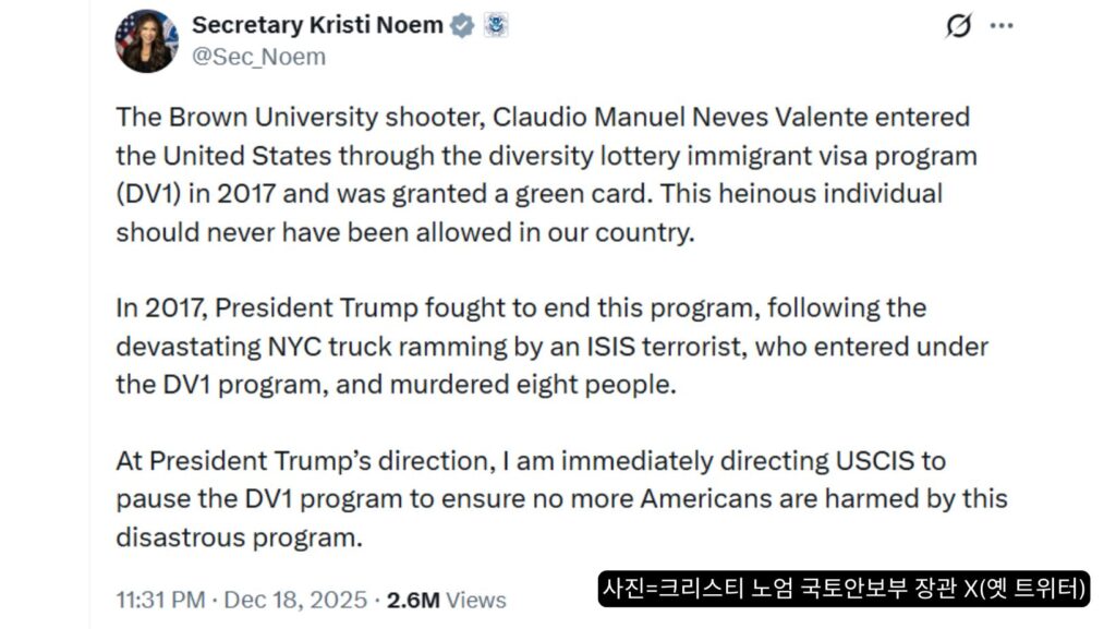 크리스티 노엄 국토안보부 장관은 19일 X(옛 트위터)를 통해 “브라운대학교 총격범 클라우디오 마누엘 네베스 발렌테는 2017년 다양성비자(DV1)로 미국에 들어와 영주권을 취득했다”며 “이 끔찍한 범죄자는 미국에 들어와서는 안 되는 인물이었다”고 밝혔다.