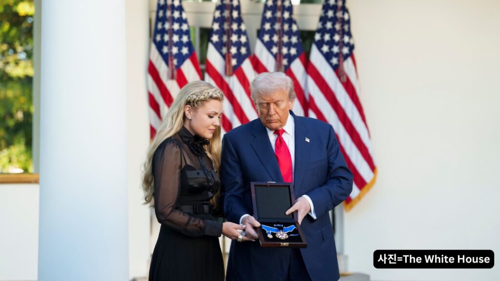 트럼프 대통령은 이날 백악관 로즈가든에서 커크에게 대통령 자유의 메달을 사후 수여했다.