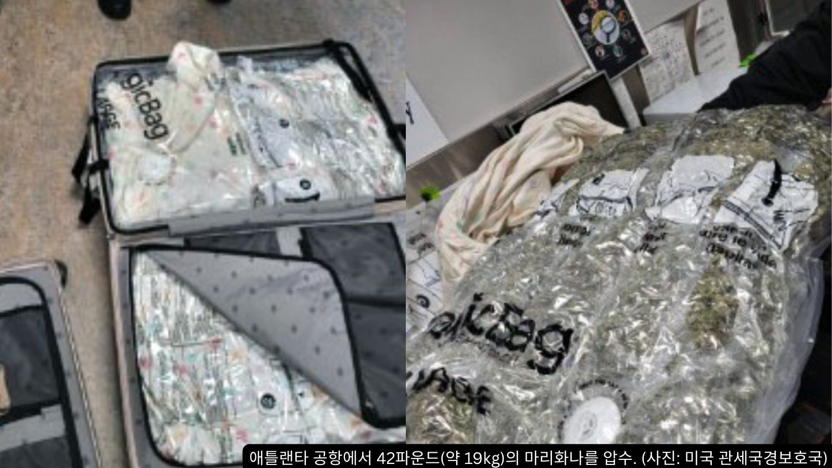 요원들이 그의 여행 가방 2개를 정밀 수색한 결과, 내부에서 진공 포장된 마리화나 4봉지, 총 42파운드(약 19kg)가 발견됐다.