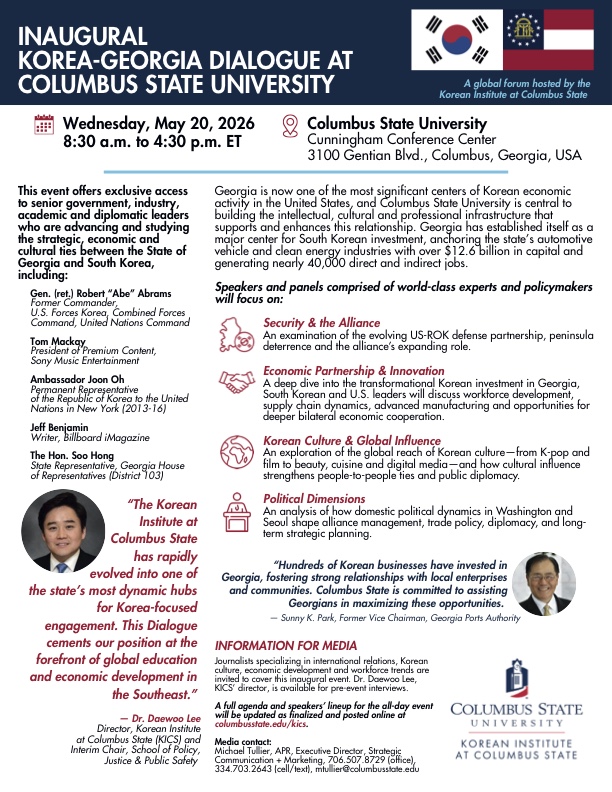 콜럼버스주립대 한국학연구소(KICS)는 오는 5월 20일, 커닝햄 컨퍼런스센터에서 ‘제1회 한국-조지아 다이얼로그’를 개최한다고 밝혔다.