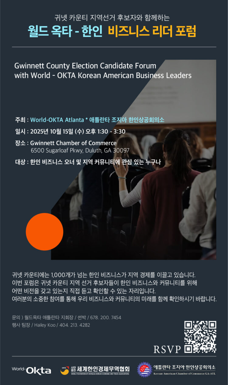 오는 11월 4일(화) 실시되는 귀넷카운티 지역선거에 출마한 후보자들이 포럼을 통해 한인 비즈니스 발전을 위한 정책 방향과 공약을 직접 설명하고, 질의응답을 통해 한인 경제인들의 목소리를 청취할 예정이다.