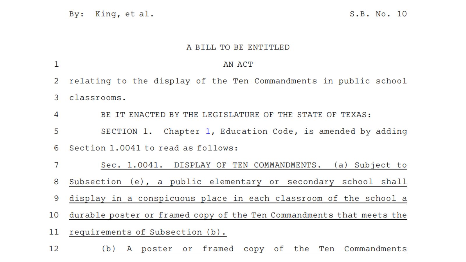 수정헌법 1조는 종교의 자유와 함께 정부가 종교를 정하는 것을 금지하고 있지만 텍사스주 의회는 지난해 6월 모든 공립학교 교실에 십계명을 게시하도록 한 법안(SB10)을 통과시켰다.