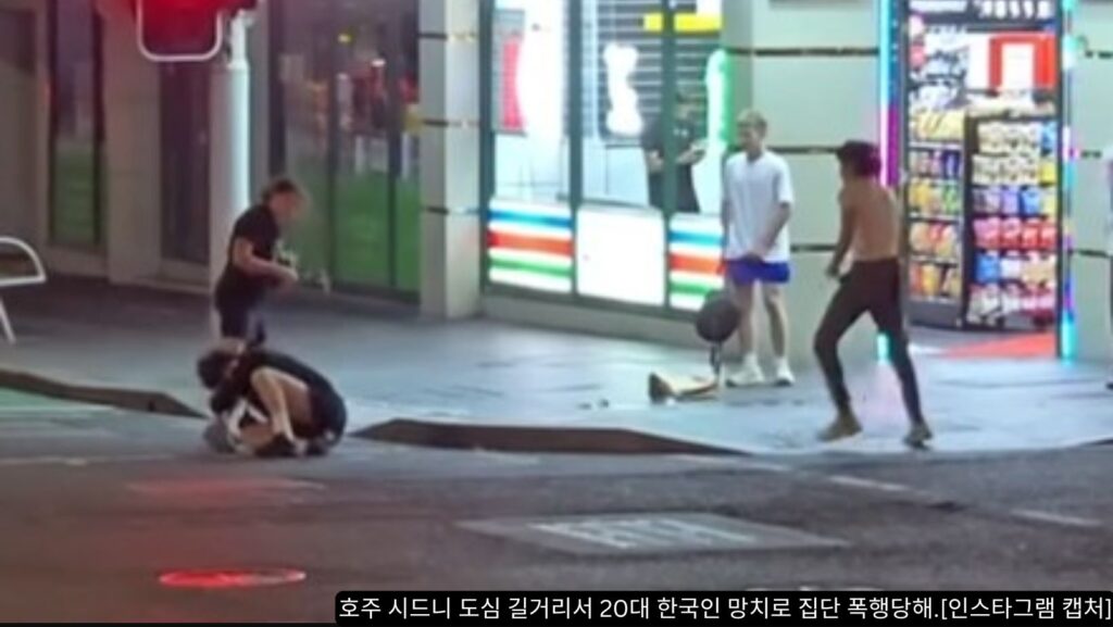 소셜미디어에 올라온 영상에는 이들이 한국인을 둘러싸고 주먹질을 해 바닥에 쓰러뜨리고 주먹질과 발길질을 가하는 모습이 담겼다.