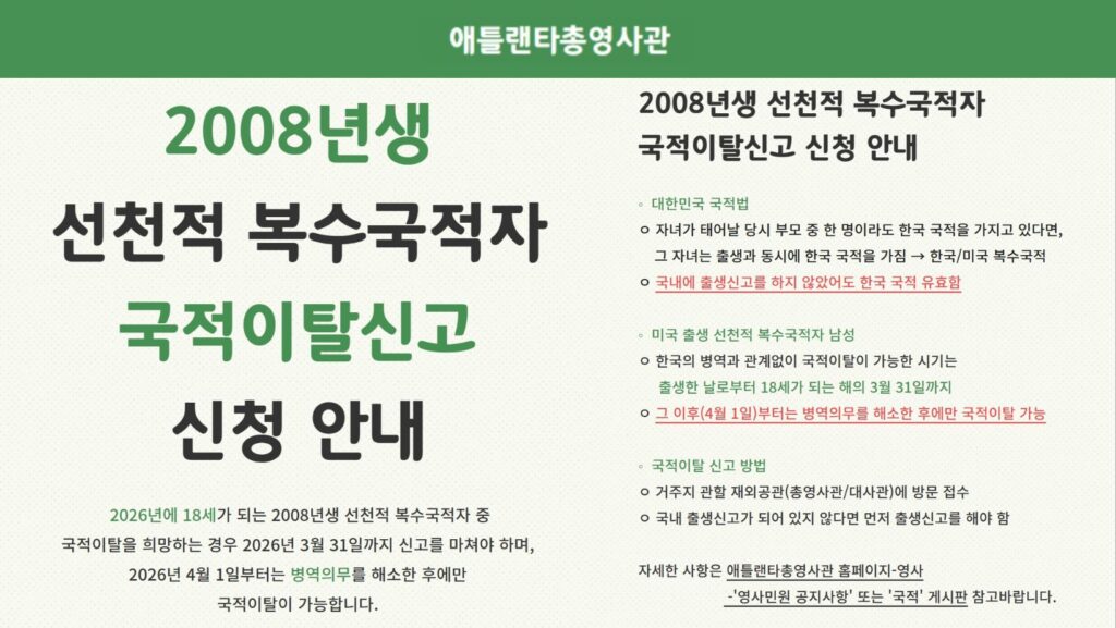 주애틀랜타총영사관(총영사 이준호)은 2026년에 만 18세가 되는 2008년생 선천적 복수국적자 남성은 반드시 오는 3월 31일까지 국적이탈 신고를 완료해야 한다고 밝혔다.