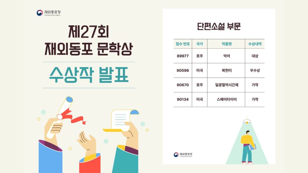 동포청은 전 세계 재외동포를 대상으로 실시한 제27회 재외동포 문학상에서 시 4편, 소설 4편, 수필 5편의 수상작을 발표했다.