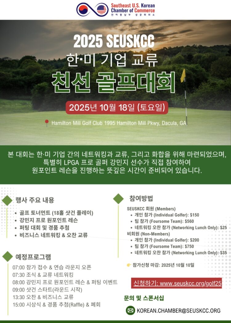 한미동남부상공회의소(SEUSKCC, 회장 김재천)가 주최하는 ‘2025 SEUSKCC 한·미 기업 교류 친선 골프대회’가 18일(토), 다큘라 소재 해밀턴 밀 골프클럽(Hamilton Mill Golf Club)에서 열린다.