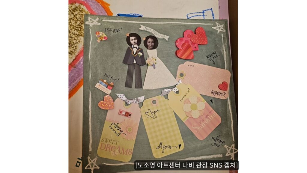 도화지에는 최태원 SK그룹 회장과 노 관장의 얼굴 사진 위에 종이로 만든 턱시도와 드레스가 붙어 있다. 또 여러 장의 메시지 카드가 장식돼 있다.