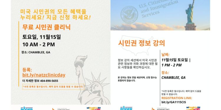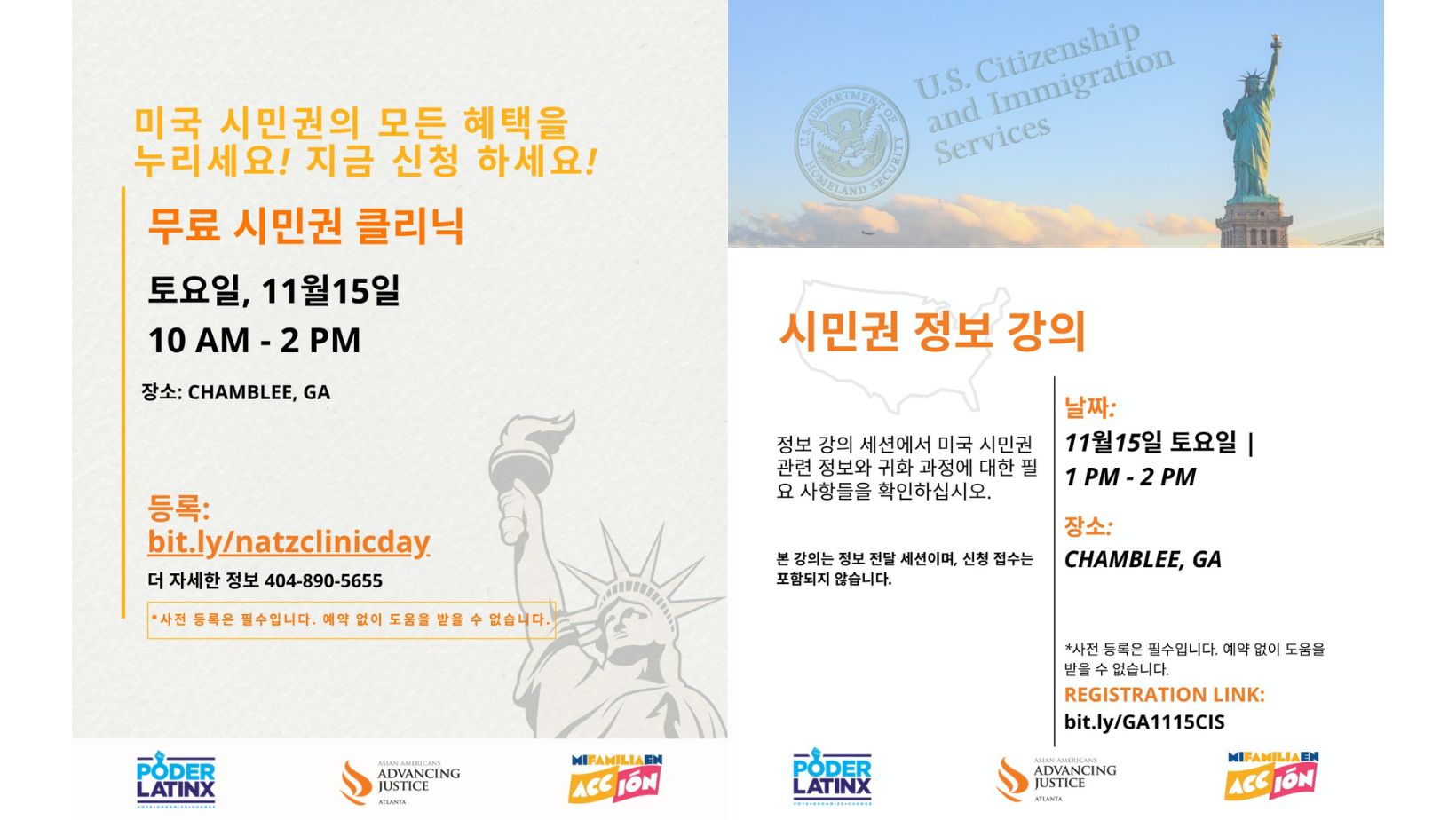 아시안아메리칸정의진흥협회(AAAJ) 애틀랜타지부가 오는 11월 15일(토), 라틴계 이민 단체 포더 라틴엑스및 미 파밀리아 보타와 함께 ‘무료 시민권 클리닉’을 개최한다.