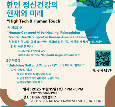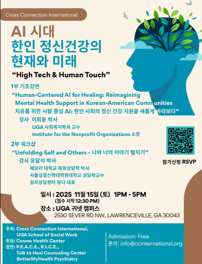 크로스 커넥션 인터내셔널(Cross Connection International)이 주최하고 조지아대학교(UGA) 사회복지학과가 후원하는 ‘AI 시대 한인 정신건강의 현재와 미래’ 세미나가 오는 15일(토) 오후 1시부터 5시까지 UGA 귀넷 캠퍼스에서 열린다.