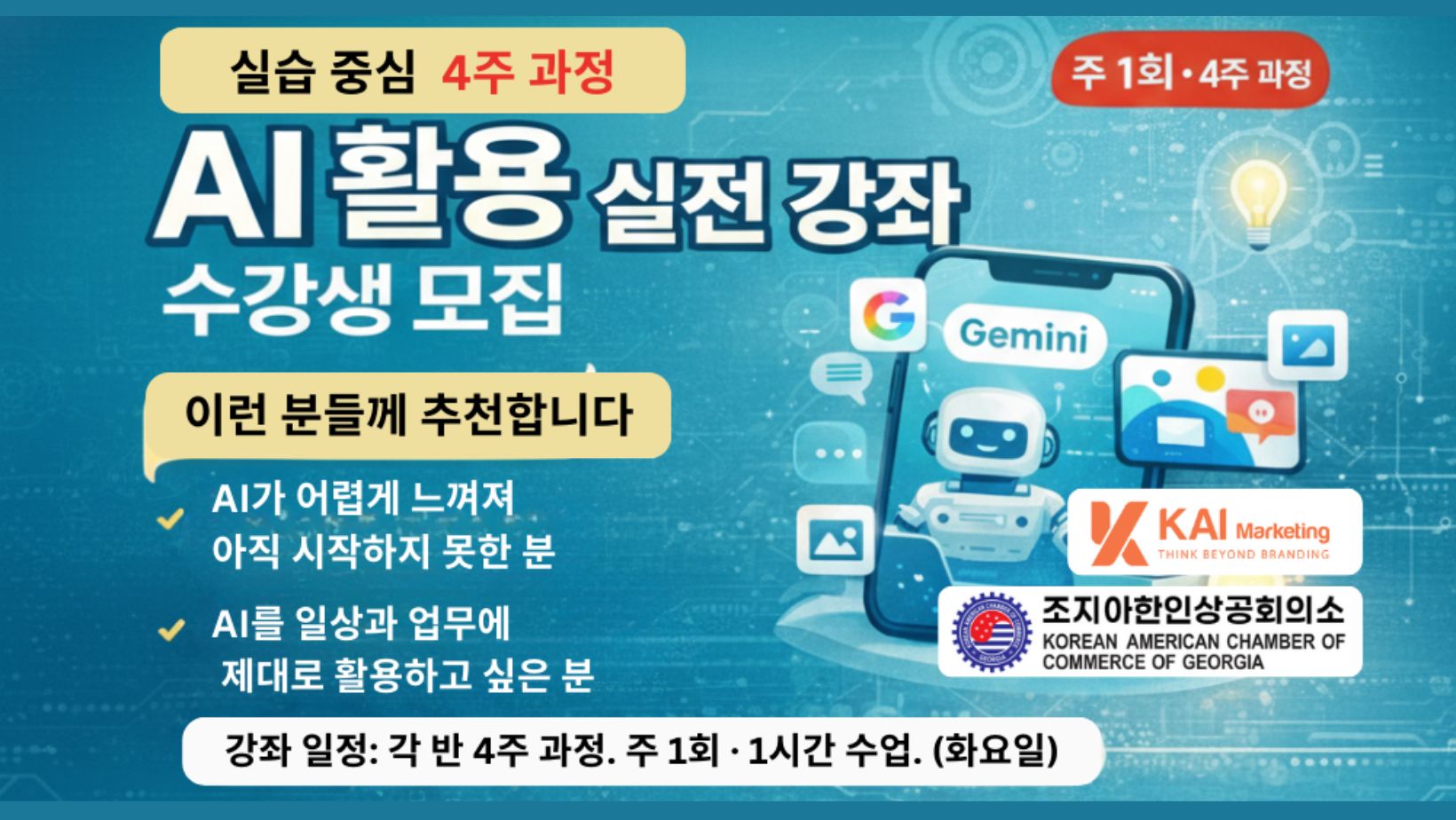 AI가 개인과 업무, 비즈니스 전반에서 필수 도구로 자리 잡은 가운데, 조지아한인상공회의소(회장 한오동)는  실습 중심의 ‘AI 활용 실전 강좌’가 초급·중급반으로 개설된다.