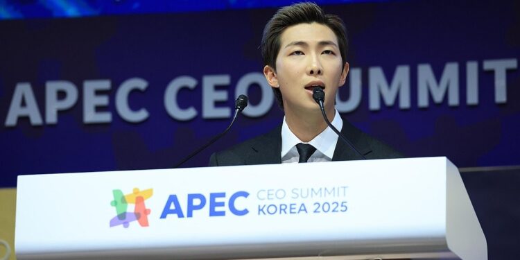 그룹 방탄소년단(BTS)의 리더 RM이 29일 경주 예술의전당에서 열린 아시아태평양경제협력체(APEC) CEO 서밋에서 “K팝은 마치 비빔밥과 같다. 서로 다른 요소들이 각자의 고유한 정체성을 지키면서도 함께 어우러져 새로운 결과물이 된다”고 말했다.