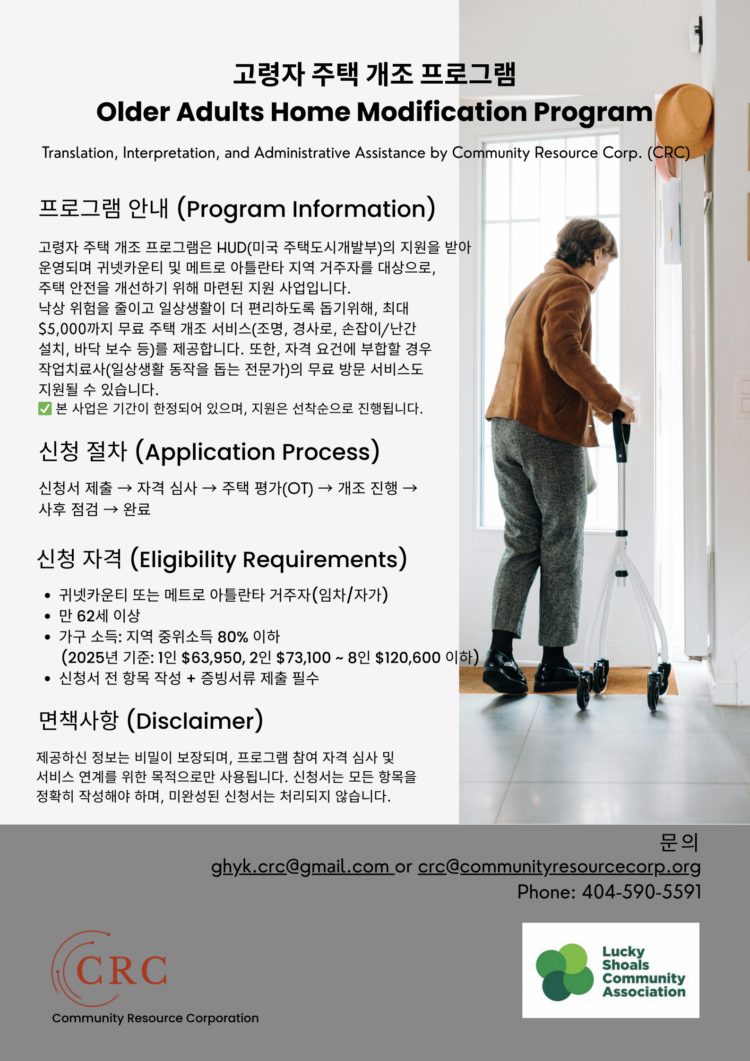 비영리단체 커뮤니티 리소스 코퍼레이션(CRC, 대표 김정하 박사)은 애틀랜타 메트로 지역 저소득 고령자들의 주거 안전을 지원하기 위한 ‘고령자 주택 개조 프로그램(Older Adults Home Modification Program)’을 실시한다고 밝혔다.